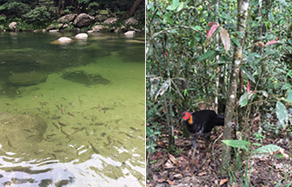そして、まだまだ旅は続きます。次に訪れたのは世界最古の熱帯雨林の中にある、モスマン渓谷。ケアンズから北上し、ポートダグラスを抜けて、もう少し先に行くとあります。渓谷の川は泳げるほどに綺麗で、お魚もたくさん!お魚用のパンを持って行き、息子が餌付けをしたので、私達の周りに魚が一杯^^!